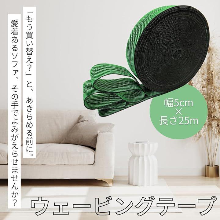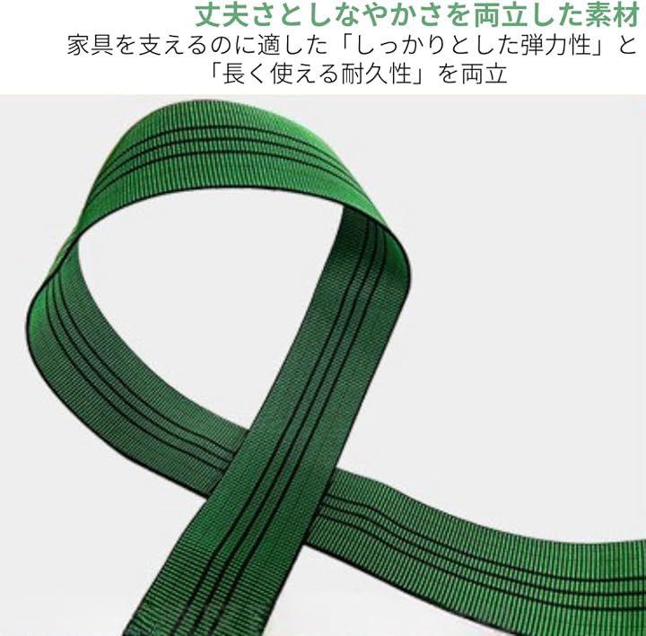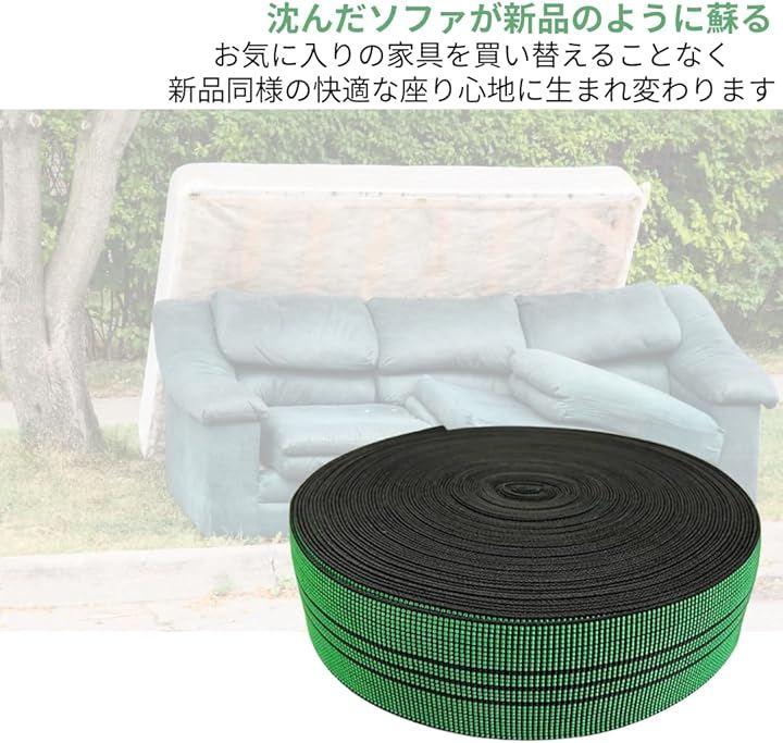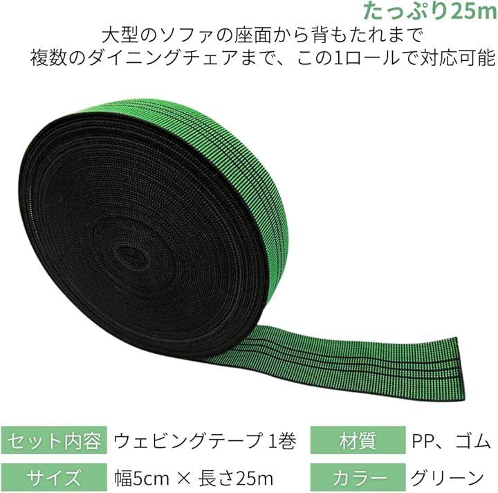 「商品詳細」セット内容:ウェビングテープ x 1巻 サイズ:幅5cm x 長さ25m カラー:グリーン 材質:PP、ゴム