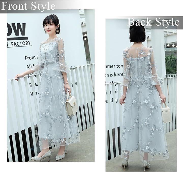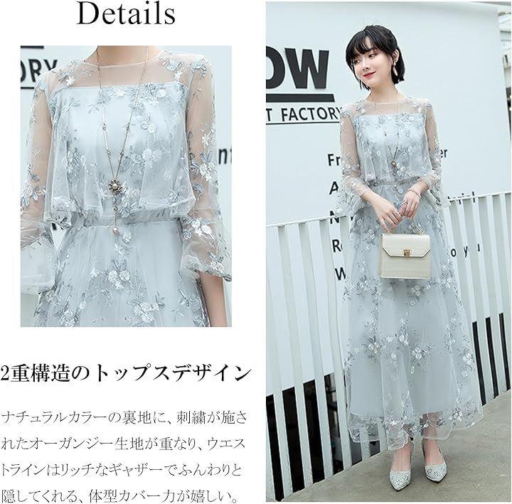 「考え抜かれたデザイン」上品でエレガントなロング、マキシ丈スカートは高いウエストラインにより足長効果が高く、全体的に2枚構造になった刺繍入りのシースルー素材とのレイヤードが、他にはないデザインで目を引きます。胸元のラインと袖には裏地がなくスッキリと細見えの効果もあり。