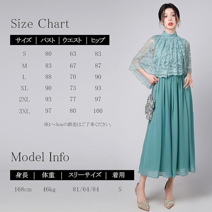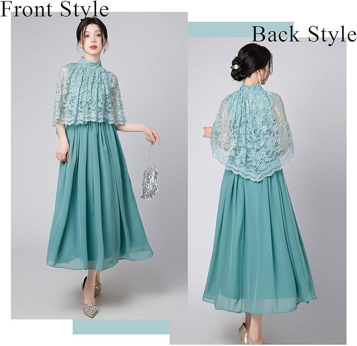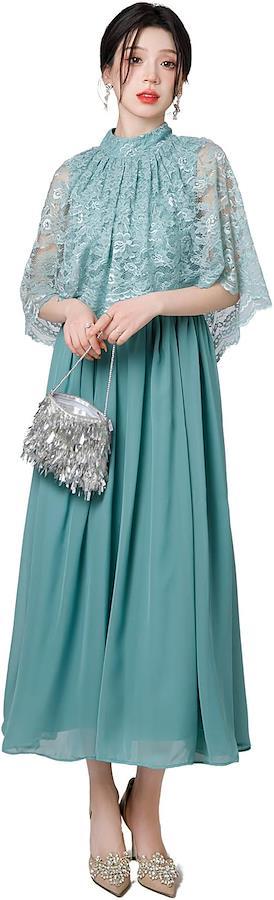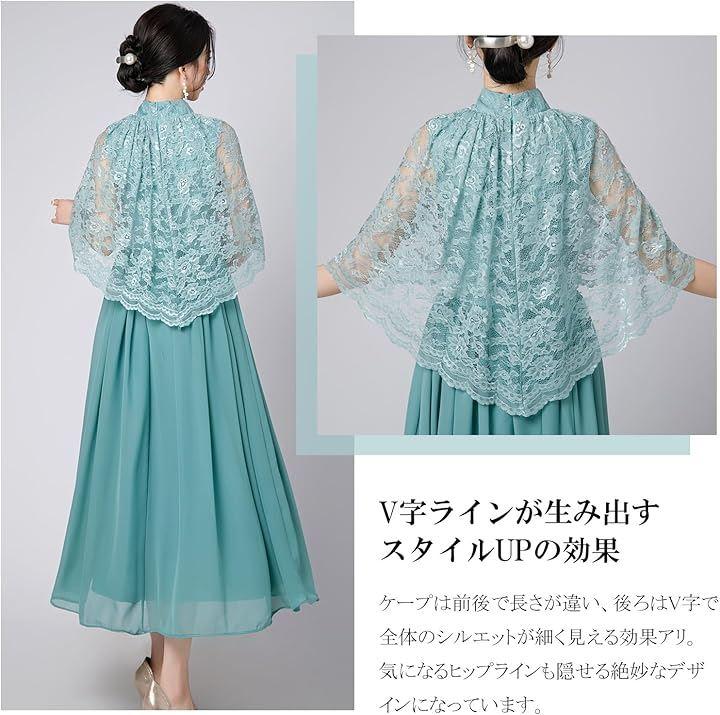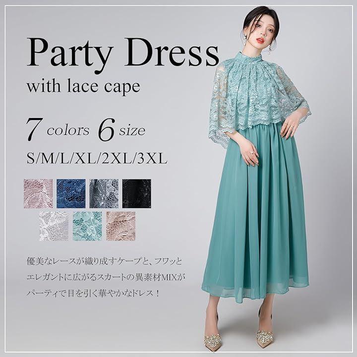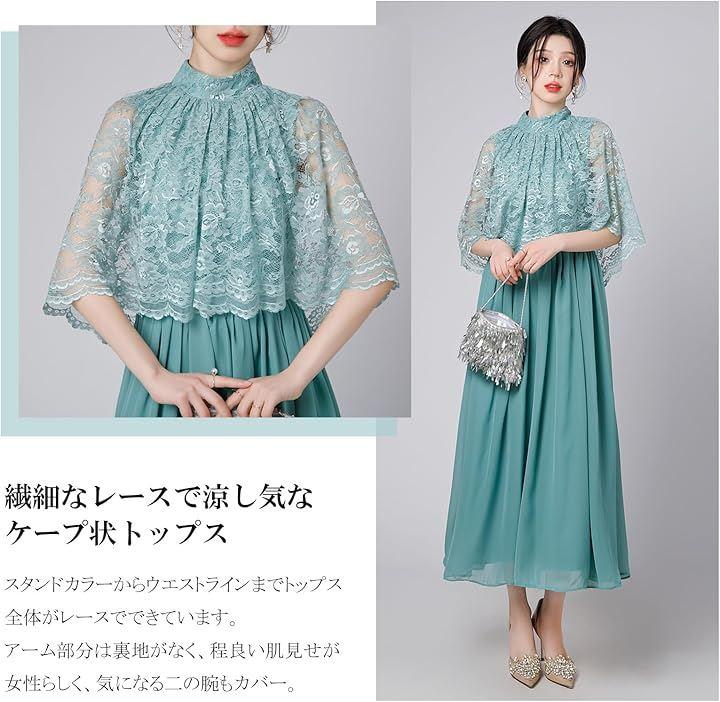 「異素材MIXの華やかなパーティドレス」 このドレスは、優美なレースが織り成すケープ状のトップスと、フワッとエレガントに広がるスカートが特徴の2ピース風ワンピースです。