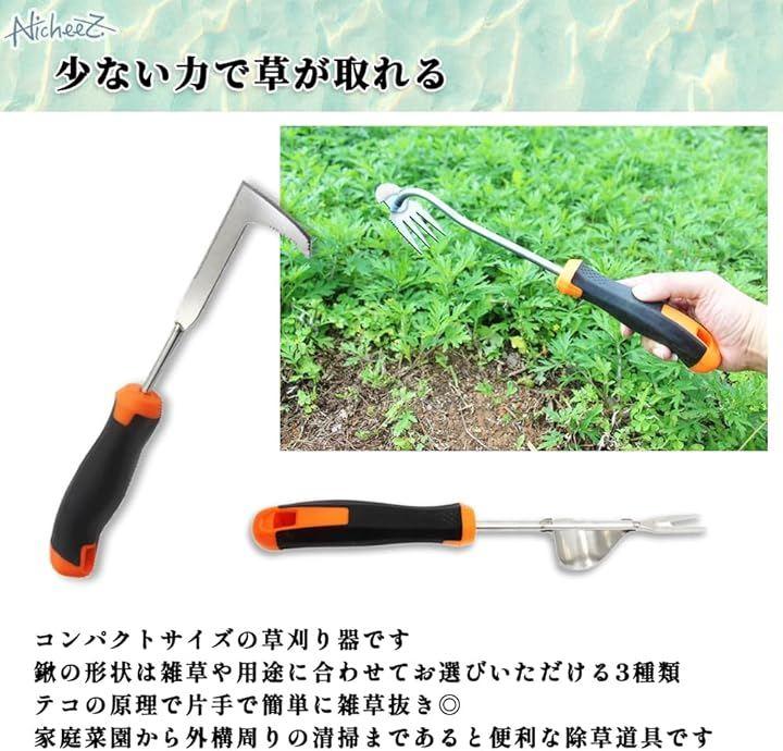 「商品内容」 草刈りツール 材質:ステンレス/シリコンゴム サイズ:(1)長さ/約34cm カマ長さ/約7.5cm カマ幅/約6.5cm 重量/約178g (2)長さ/約35cm カマ長さ/約8cm カマ幅/約4cm 重量/約213g (3)長さ/約35cm カマ長さ/約5cm 重量/約195g