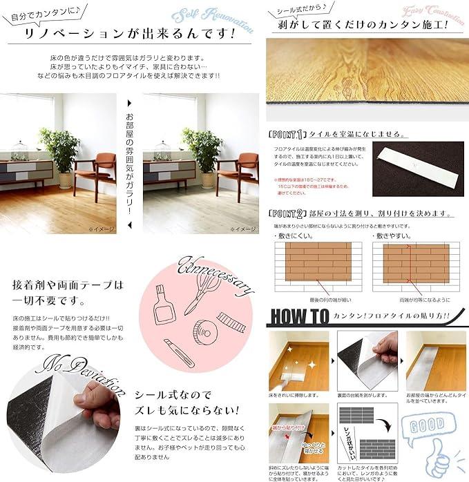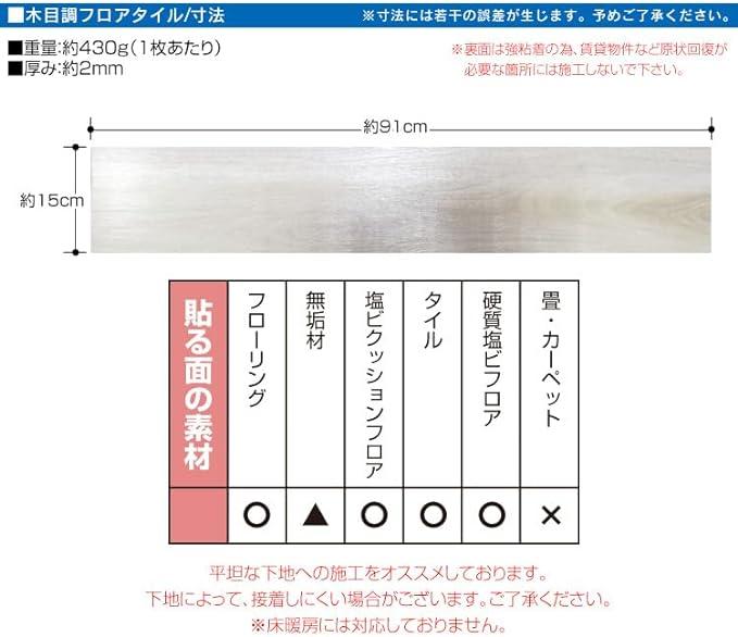 この商品について 【商品内容】フロアタイル12ケース(144枚入) 【商品仕様】カラー:ナチュラル / サイズ(約):幅910mm×奥行150mm×厚み2mm ※1枚あたり / 重量(約):430g ※1枚あたり / 素材:PVC 【注意事項】・畳や絨毯のようにやわらかい場所や凹凸のある場所ではご使用できません。必ず硬くて平らな床の上でご使用ください。・サイズには若干の誤差がありますので、タイル同士の隙間で調整しながら敷き詰めてください。・床暖房のお部屋にはご使用できません。・気温や湿度の変化でタイルが伸縮する場合があります。ぴったりと敷き詰めすぎると、伸びた際に突き合ってタイルが浮き上がってしまいますので少し隙間を開けながら敷きこんでください。・気温が低い場合は、接着力が弱くなりますので部屋を温めるかドライヤー等で商品を暖めてから作業してください。・この商品はケース販売のみです。 申し訳ございませんが枚売りが出来ません。・生産ロットが違う場合、柄/色味が若干変わってくる場合がございます。 【注意事項】・商品を使用して発生した事故/トラブル/破損等につきましては一切の責任を負いかねます。・商品はモニターによって色合いが異なって見える場合があります。・仕様/デザインは改良のため予告なく変更することがあります。 自分で出来る、簡単リノベーション!お部屋の雰囲気ガラリと変わるフロアタイルです。床を変えることで、今までと全く違ったお部屋に大変身♪裏面は粘着性があるので、接着剤なしで施工可能。シートをはがして貼るだけ!超カンタンです♪ハサミ/カッターでカットできて扱いやすく、女性でも部屋の隅々まで貼ることができます。ご自宅のお部屋をオシャレにしたいけど、今の床の色味が気に入らない、などのお悩みのお客様にぴったり!ホワイト/ナチュラル/ブラウン/グレー/ヴィンテージの5色から選べて、北欧風や西海岸風など、どんなインテリアのテイストにも合わせやすく、おしゃれなフロアが誰でも気軽に楽しめます。