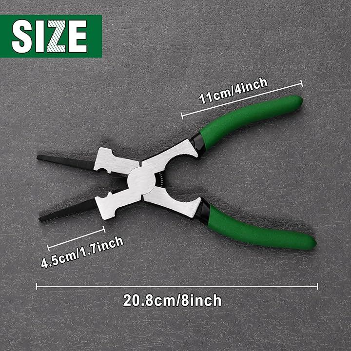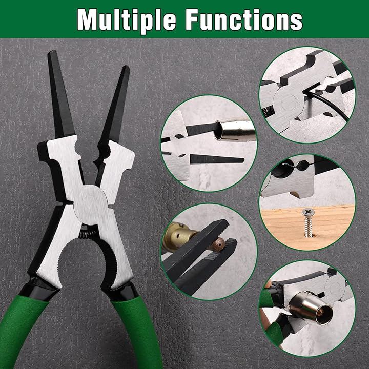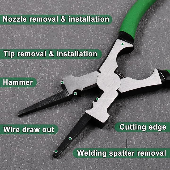 多機能デザイン: MIG溶接用プライヤーは、ワイヤー引き抜き・スパッタ除去・チップ交換・ハンマー作業・ワイヤー切断・ノズル交換など、溶接作業に必要な多様な機能を一本でこなすプロ仕様のツールです。