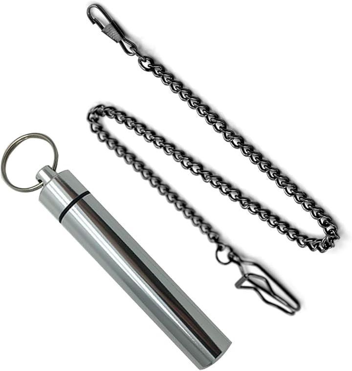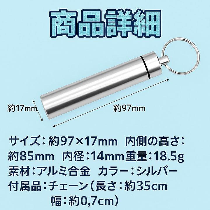 「商品仕様」サイズ:約97x17mm 内側の高さ:約85mm 内径:約14mm 重量:約18.5g 素材:アルミ合金 カラー:シルバー 付属品:チェーン(長さ:約35cm、幅:約0.7cm)