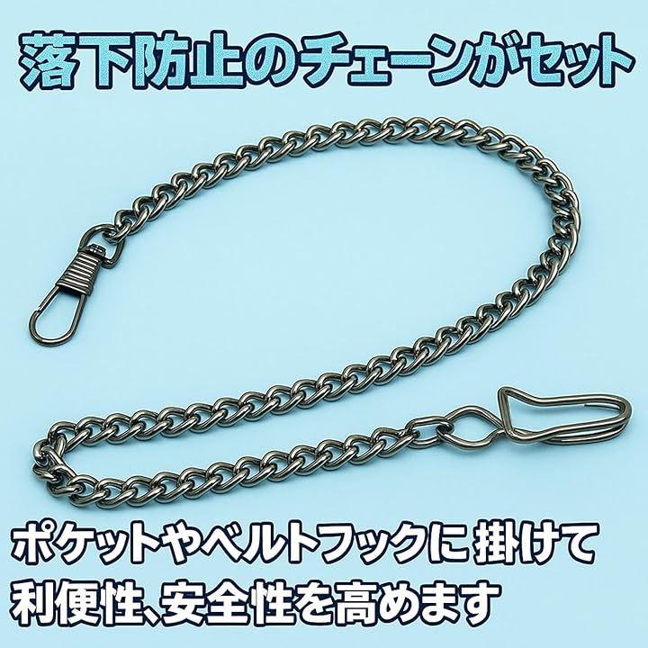 「落下防止チェーン付き」ケースと接続できるチェーンが付属し、ポケットやベルトフックに引っ掛けられる設計。