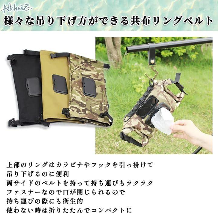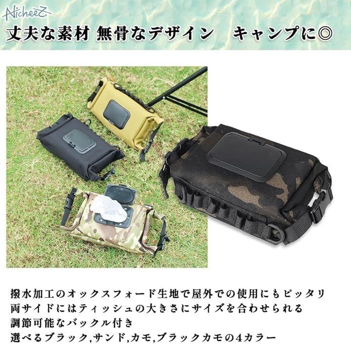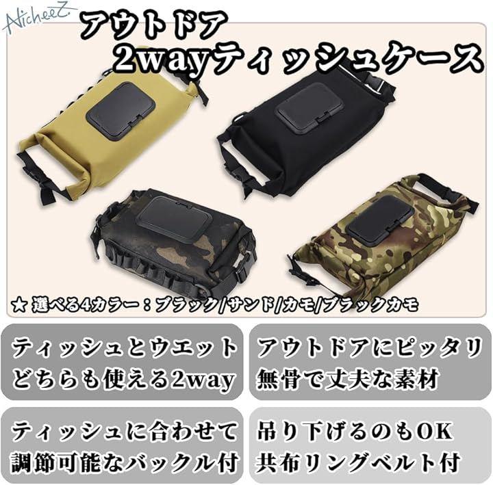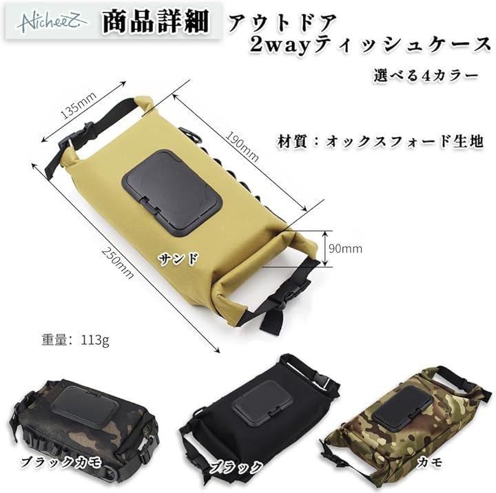 「商品内容」 アウトドア2wayティッシュケース 材質:オックスフォード生地 カラー:ブラック/サンド/カモ/ブラックカモ サイズ:横/約19cm 縦/約13.5cm 厚さ/約9cm