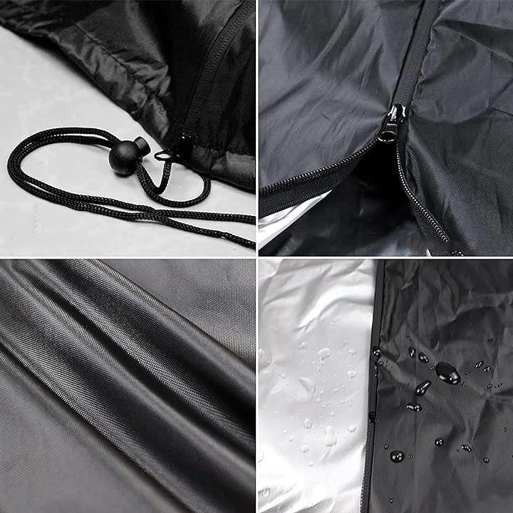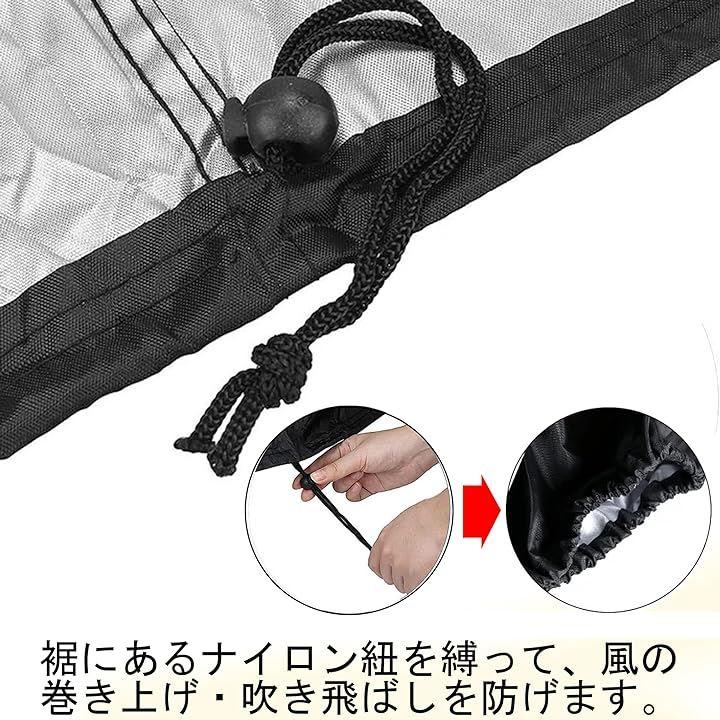 自転車のカバーの様に裾にあるナイロン紐を縛って、風による巻き上げ・吹き飛ばしを防ぐこともできます。