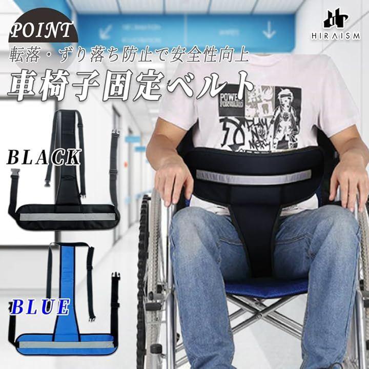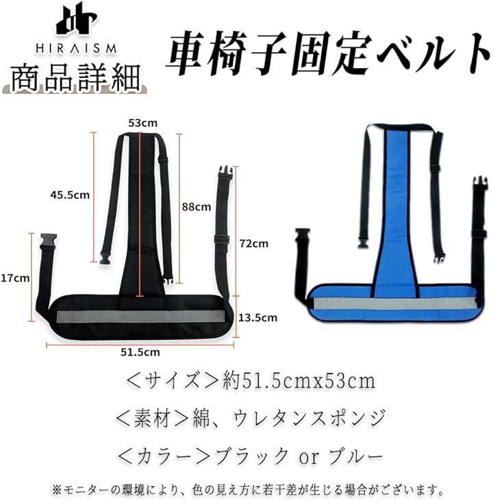 「商品内容」車椅子固定ベルト <サイズ>約51.5cmx53cm <素材>綿、ウレタンスポンジ <カラー>ブラック or ブルー
