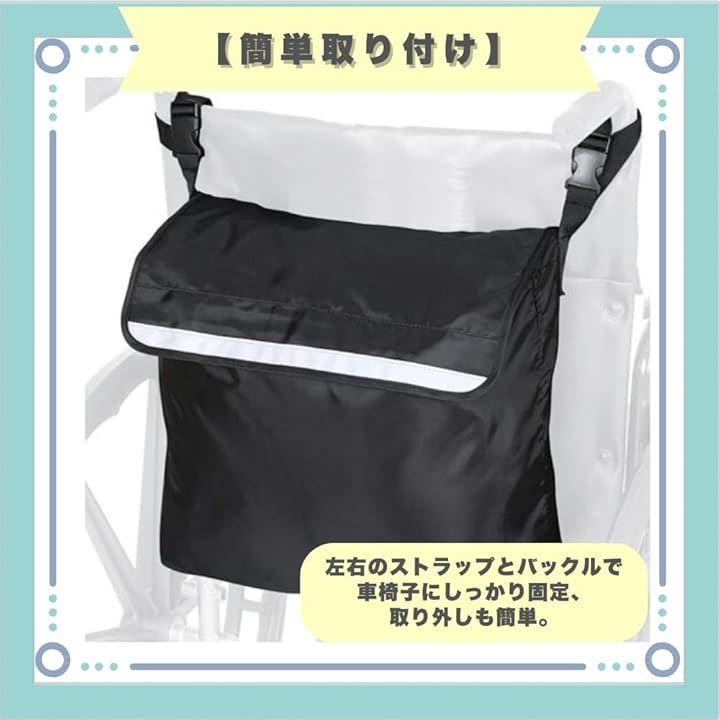 「簡単取り付け」左右のストラップとバックルで車椅子にしっかり固定、取り外しも簡単。