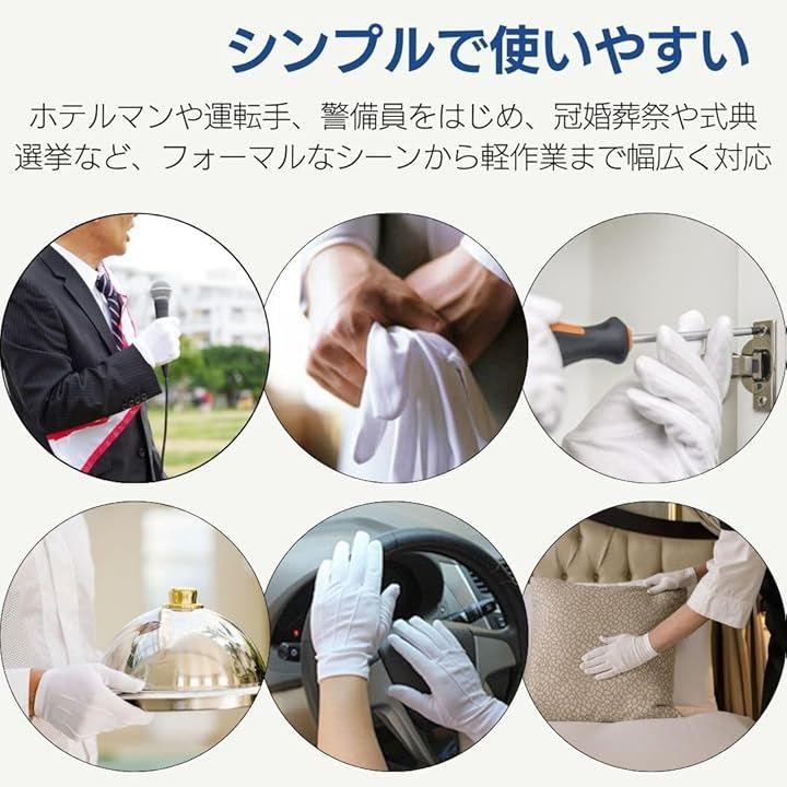 「様々な場面で大活躍」ホテルマンや運転手、警備員をはじめ、冠婚葬祭や式典、選挙など、フォーマルなシーンから軽作業まで幅広い用途に対応する白手袋。