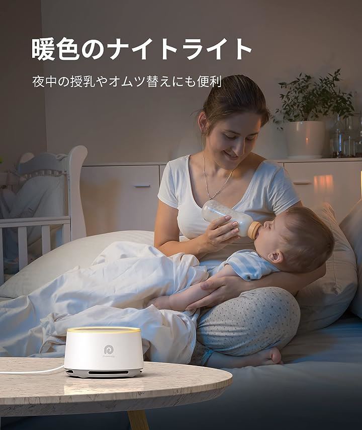 暖色系のナイトライト搭載(呼吸式点灯+通常点灯):暖色系の光で暖かい雰囲気を作り出し、丁度いい灯りは睡眠に刺激にならず、夜中の授乳やオムツ換えに便利し、夜中の躓き転倒防止にも役に立つ。