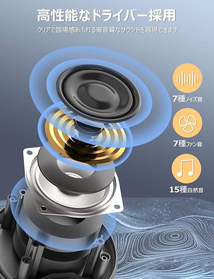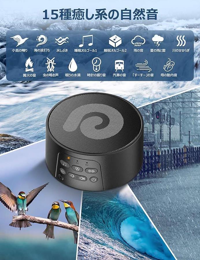ホワイトノイズマシンD3 Proは7種のノイズ音、7種のファン音と15種の自然音(小鳥の囀り、海の波打ち、水しぶき、睡眠オルゴール1、睡眠オルゴール2、雨の音、夏の雨と雷、川のせせらぎ、篝火の音、虫の鳴き声、眠りの水滴、時計の振り音、電車の走行音、「すーすー」の音、母の胎内音)が用意されています。