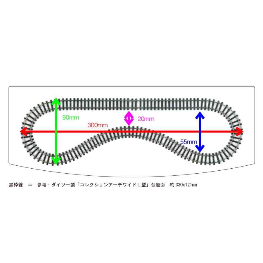 レール寸法(最外径): 約300mm × 約90mm、実際には車両が走行時に当たらないように、より線路から離れたエリアに建物などの模型を設置する必要あり。