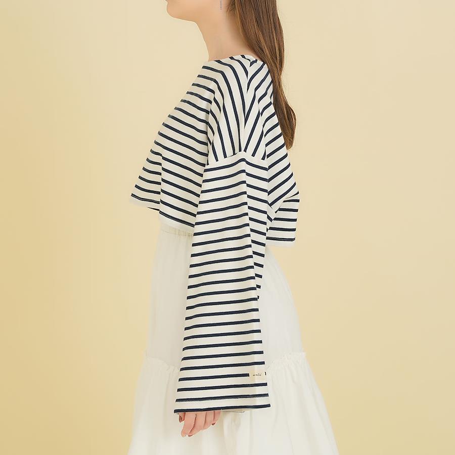 【デザイン】ワイドスリーブがmoulisらしいデザイン。クロップド丈が今年らしく、1枚で旬コーデになるアイテムです。襟ぐりはすっきりとしたボートネックになっているので、骨格問わずすっきりと着ていただけます。