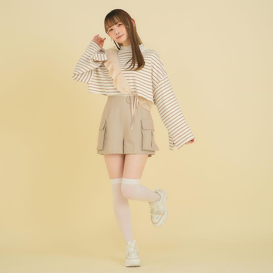 【コーディネート】クロップド丈なので、ハイウエストデザインのボトムと相性抜群。ボリュームのあるティアードスカートやワイドパンツとのコーデが今年っぽくおすすめです。お腹まわりが気になる方は、インナーを着用すれば安心して着ていただけます◎《透け感》カラーによってあり 《生地の厚さ》普通 《裏地》なし 《伸縮性》ややあり《生産国》中国