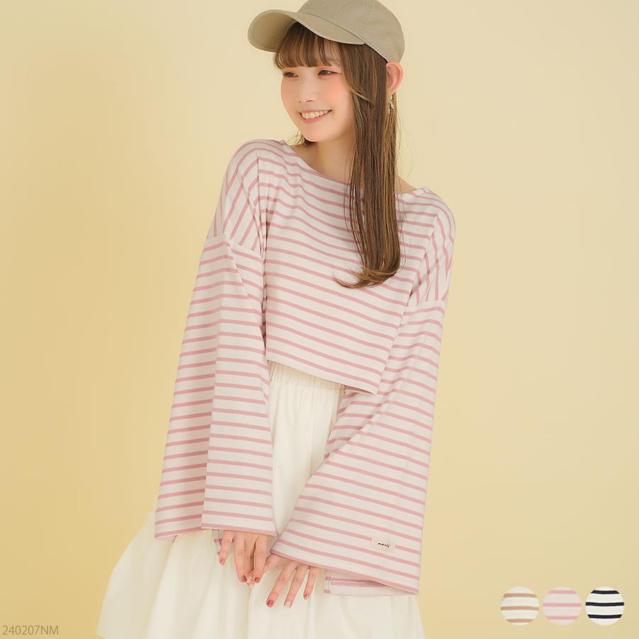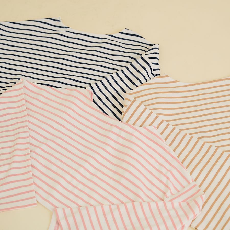 【素材】やわらかいカットソー素材を使用。薄すぎない生地で肌ざわりも良いです。淡色コーデにぴったりなベージュに、今年トレンドのピンク、どんなシーンでも活躍するネイビーの3色をご用意。