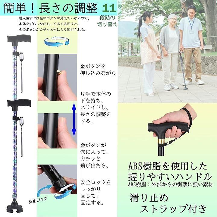 また、長時間使用しても疲れにくい形状で、ハンドルストラップを手首に通すことによって、杖の落下を防ぐことができる。