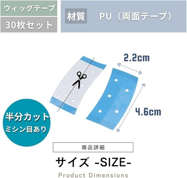 「商品内容」パッケージ内容:ウィッグ用テープ30枚セット(肌用両面テープ) サイズ(約):全長4.6cm 幅2.2cm(ミシン目あり)、素材:PU *サイズ詳細は商品画像をご確認ください。