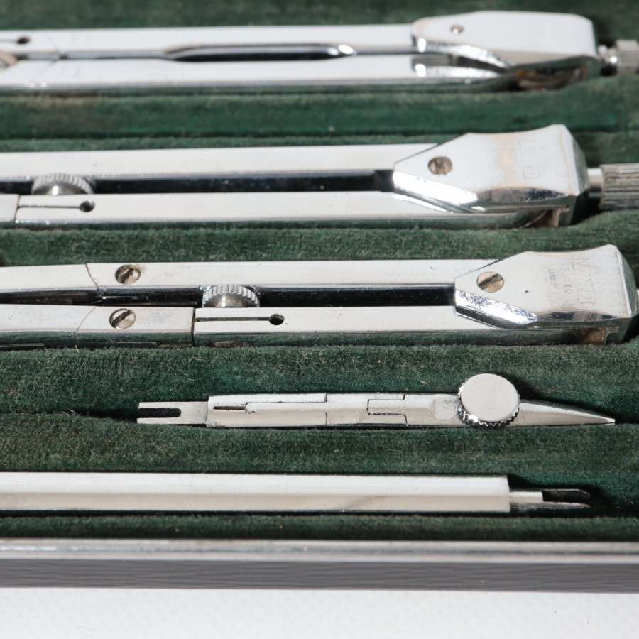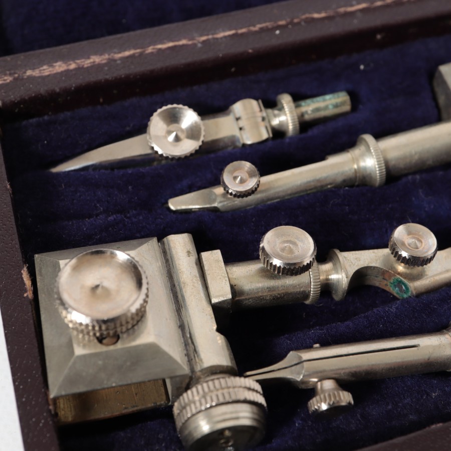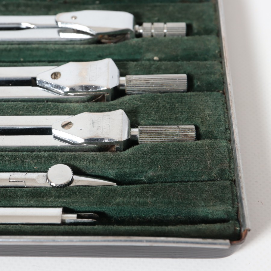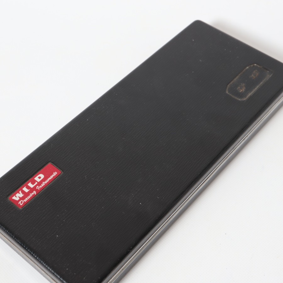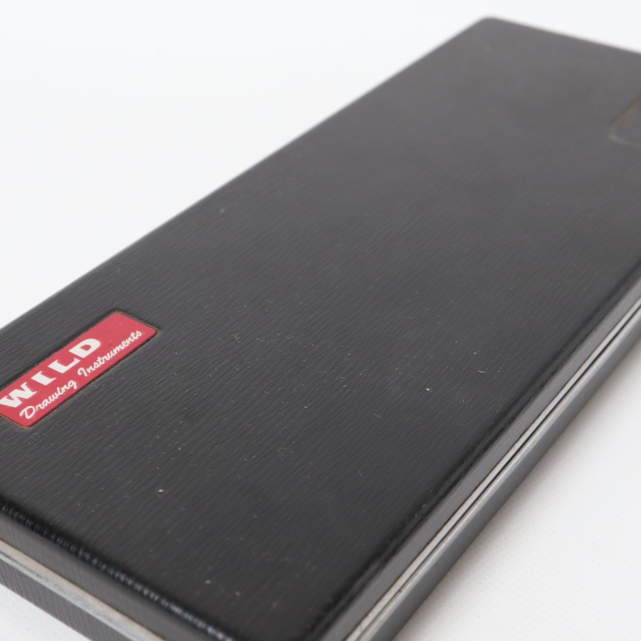 スイスの精密機器メーカー、WILD HEERBRUGG(ウィルド・ヘールブルック)製の精密製図器セットです。本体には「WILD HEERBRUGG TOKYO」の刻印があり、精巧なローレット加工が施された昭和中期の希少な一品です。メインの製図セットに加え、ビームコンパス用のアタッチメントパーツが収められた拡張セットをまとめた内容となっています。