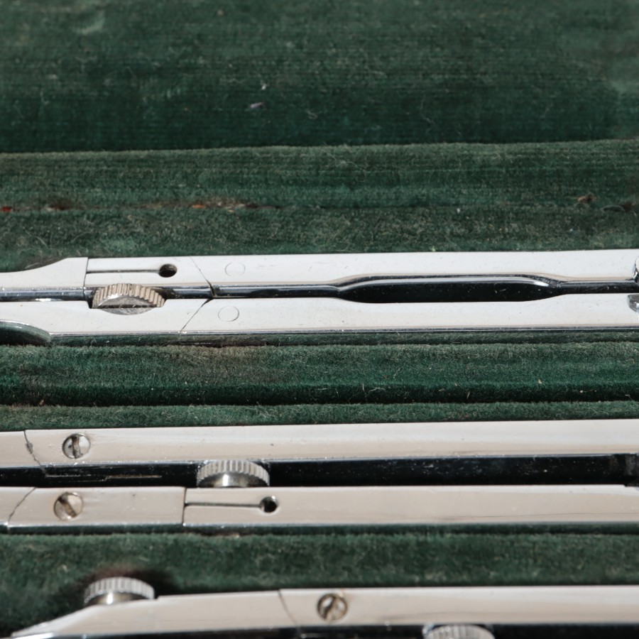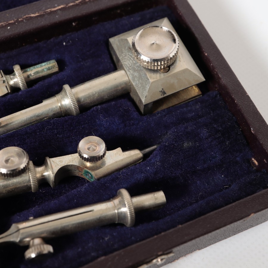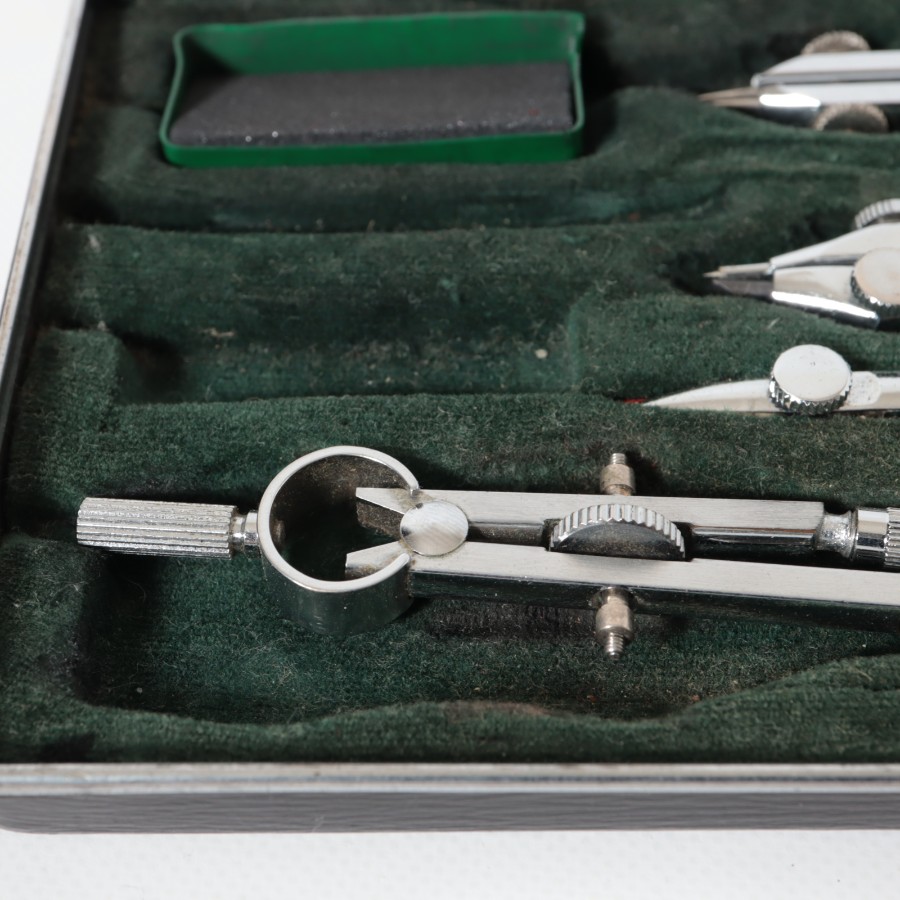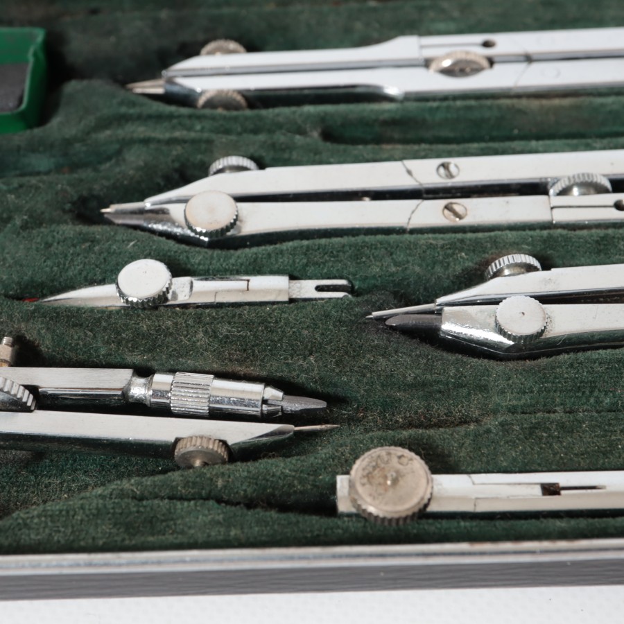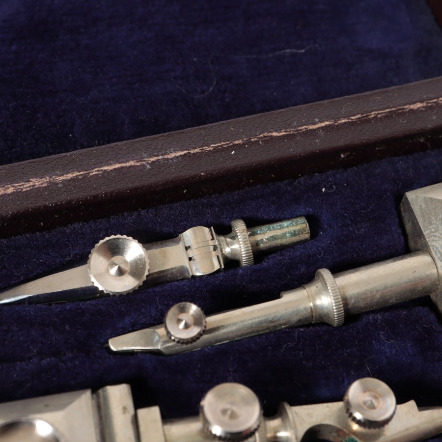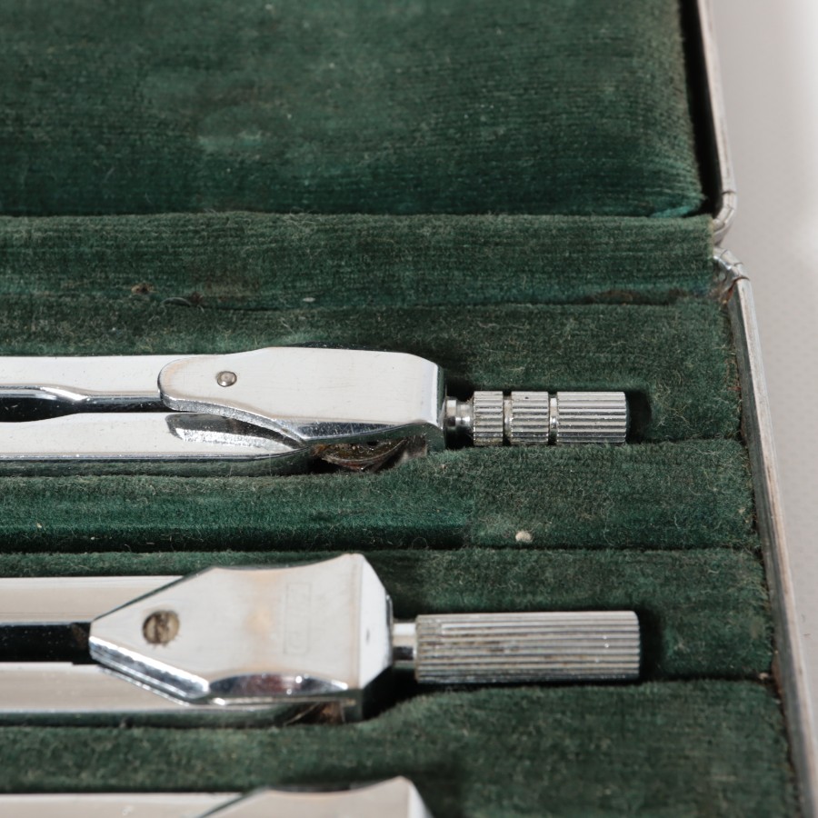 スイスの精密機器メーカー、WILD HEERBRUGG(ウィルド・ヘールブルック)製の精密製図器セットです。本体には「WILD HEERBRUGG TOKYO」の刻印があり、精巧なローレット加工が施された昭和中期の希少な一品です。メインの製図セットに加え、ビームコンパス用のアタッチメントパーツが収められた拡張セットをまとめた内容となっています。