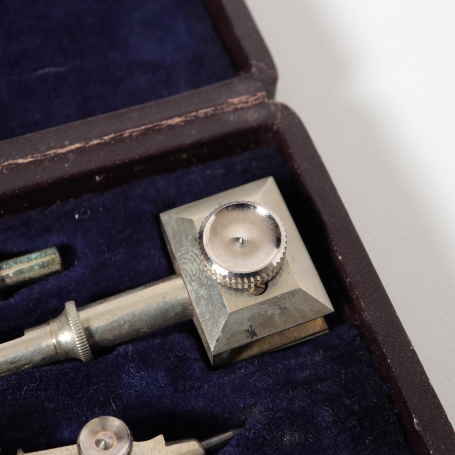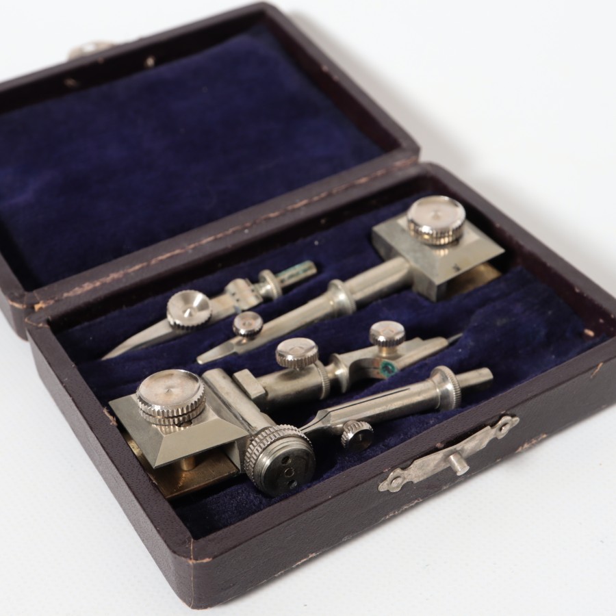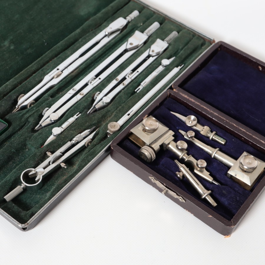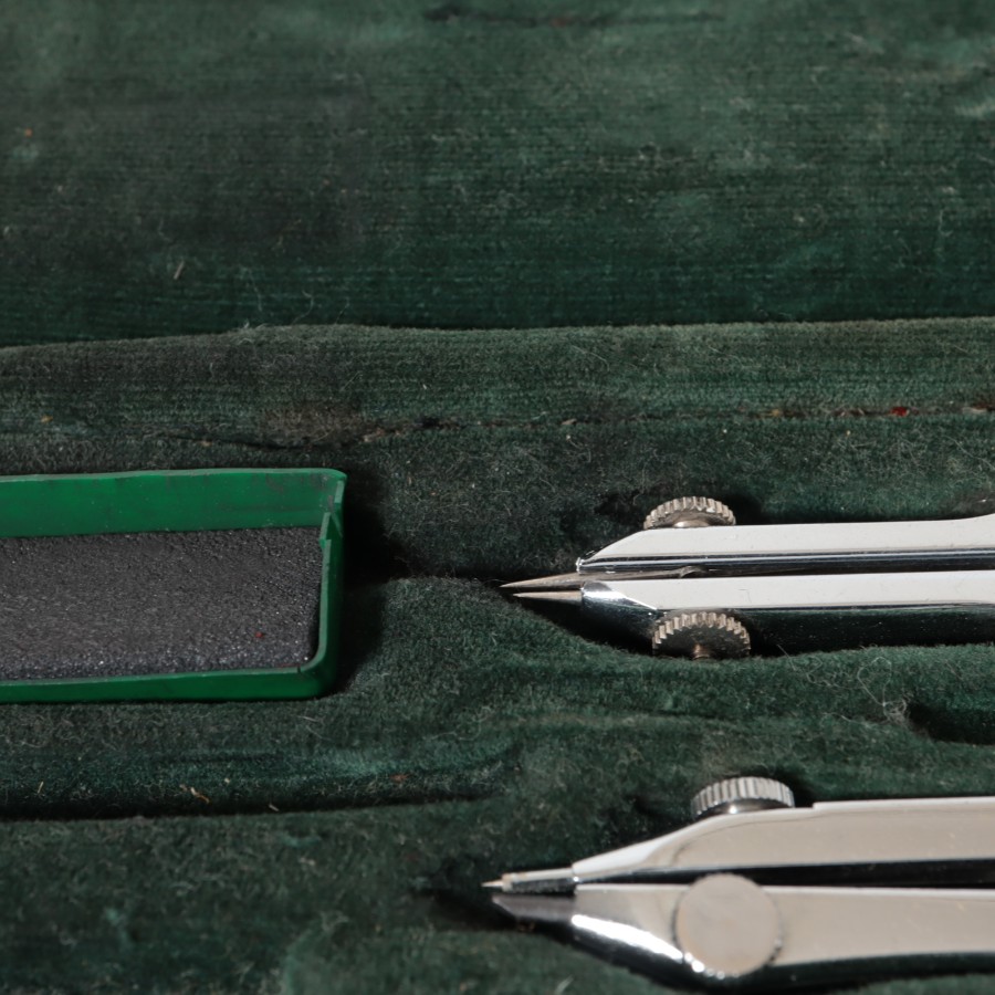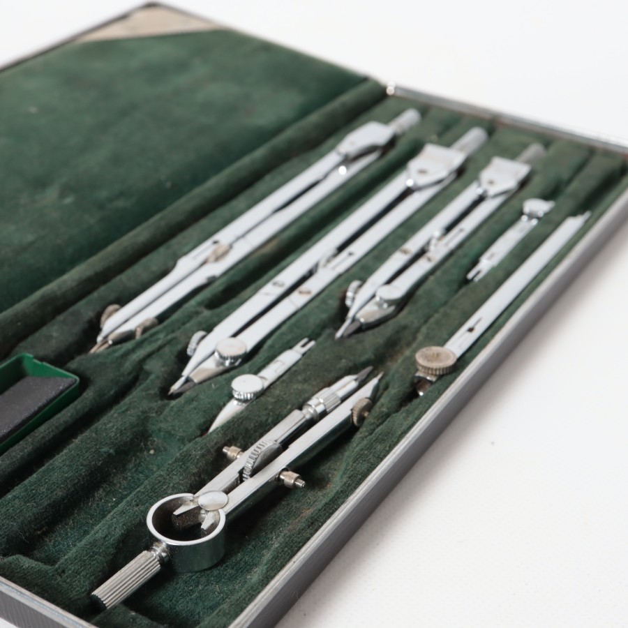 スイスの精密機器メーカー、WILD HEERBRUGG(ウィルド・ヘールブルック)製の精密製図器セットです。本体には「WILD HEERBRUGG TOKYO」の刻印があり、精巧なローレット加工が施された昭和中期の希少な一品です。メインの製図セットに加え、ビームコンパス用のアタッチメントパーツが収められた拡張セットをまとめた内容となっています。