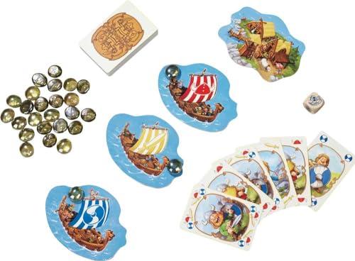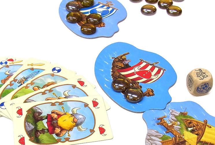 『ワイルドバイキング』は、循環する船に載せられていく宝石を狙って、色ごとのカード枚数で競り合い、宝石を勝ち取っていくゲームです。 ★ここがおすすめ 手札カードの色分布や船の順番、積まれている宝石の数から、競り合いでの我慢どころや注ぎ込みどころを考えるのが楽しいゲームです。ゲームの手順は非常にシンプルなので、子供たちと一緒に船に積まれていく宝石にワクワクしたりと手軽に楽しく遊べるゲームながら、限られた手札をどう活用していくか、というマネジメントの要素もしっかり詰まっていて、遊びながら「どうしたら上手くできそうか」と戦略を考え始めるきっかけを与えてくれるゲームとしても非常に優れています。 また、コンパクトな箱の中にボード、サイコロ、カード、ガラス製のしっかりと重みのある宝石といった内容物がぎゅっと詰まっているのも嬉しいポイントです。 子供から大人まで幅広い年齢向けとしてとてもおすすめです。 対象:6才?大人 人数:2?5人用 所要:15分 作者 : Wolfgang Dirscherlヴォルフガング ディルシェール イラスト : Michael Menzel ミヒャエル メンツェル メーカー : すごろくや(日本) 初版発行年 : 2008年 販売元 : すごろくや(日本) 国内版発行年 : 2023年12月 箱サイズ : 115 × 180 × 35mm 内容物 : バイキング村ボード 1枚, 船ボード 3枚, 宝石 40個, 装備カード 60枚, サイコロ 1個, 説明書 1部 説明書言語 : 日本語, 英語 製造国 : 中国 モニターの発色の具合によって、実際のものと色が異なる場合がございます。 Material : ガラス