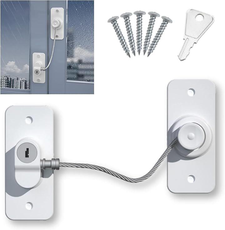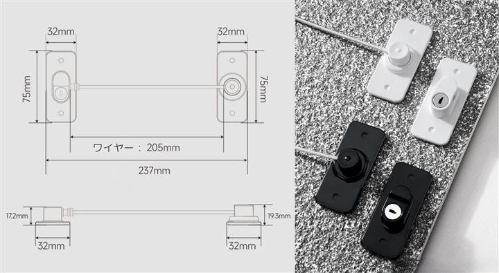 「セット内容」本体(粘着テープ付き)+粘着補助シート+鍵1個+ネジ4個・「サイズ」本体:75x32mm/ワイヤー205mm「カラー」ホワイト・ブラック「素材」強化ABS樹脂「機能」穴あけ不要/粘着テープ設置/実物鍵式ロック/360度回転/強化ワイヤー/ネジ設置対応「設置例」引き戸/開き戸/窓/冷蔵庫/洗濯機/金庫/キャビネットなど