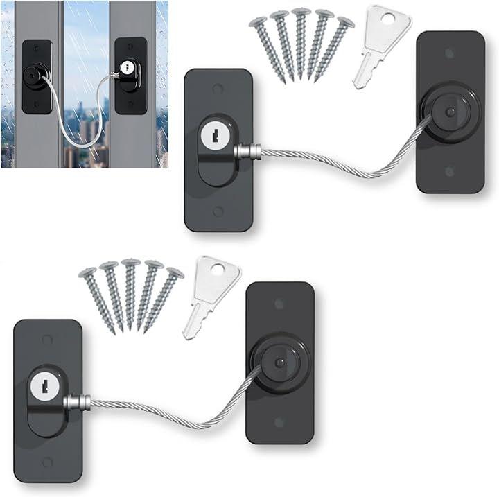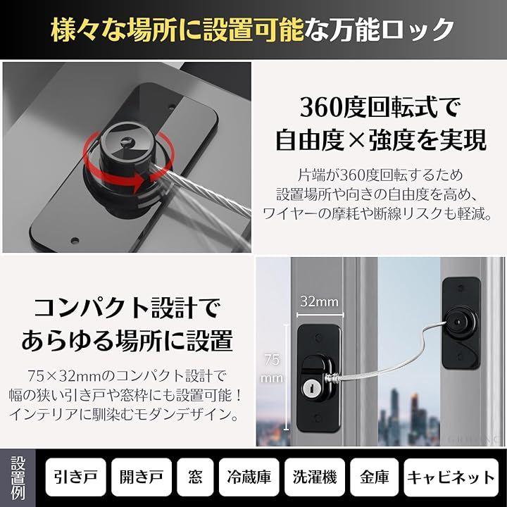 「セット内容」本体(粘着テープ付き)+粘着補助シート+鍵1個+ネジ4個「サイズ」本体:75x32mm/ワイヤー205mm「カラー」ホワイト・ブラック「素材」強化ABS樹脂「機能」穴あけ不要/粘着テープ設置/実物鍵式ロック/360度回転/強化ワイヤー/ネジ設置対応「設置例」引き戸/開き戸/窓/冷蔵庫/洗濯機/金庫/キャビネットなど