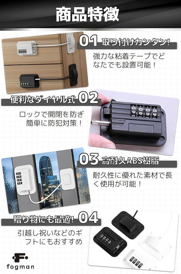 「商品特徴」(1)取り付けカンタン.:強力な粘着テープでどなたでも設置可能。/(2)便利なダイヤル式:ロックで開閉を防ぎ簡単に防犯対策。/(3)高耐久ABS樹脂:耐久性に優れた素材で長く使用が可能。/(4)贈り物にも最適.:引越し祝いなどのギフトにもおすすめ