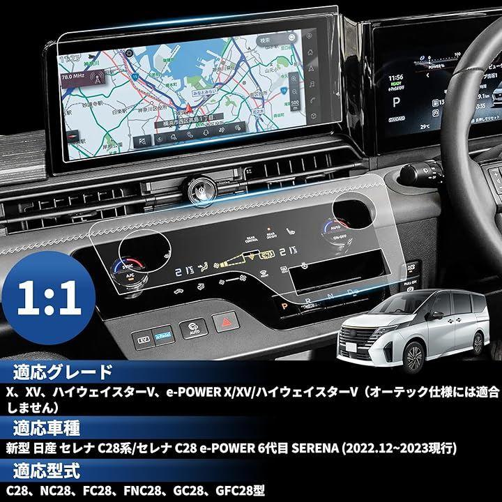 「対応車種」新型 日産 セレナ C28系/セレナ C28 e-POWER 6代目 SERENA (2022.12~2023現行) 「適応グレード」X、XV、ハイウェイスターV、e-POWER X/XV/ハイウェイスターV(☛オーテック仕様には適合しません)「適応型式」C28、NC28、FC28、FNC28、GC28、GFC28型 *セット内容:12.3センチナビ(強化ガラス1枚) +エアコン保護フィルム(強化ガラス1枚) +クリーニングキット(拭き取り紙、クリーニングクロス、ホコリ除去シール)。
