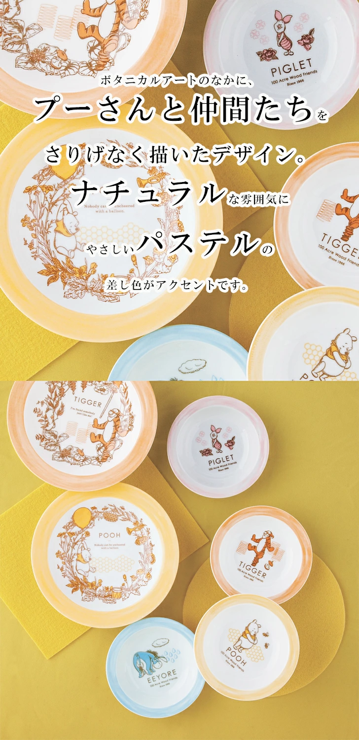 ボタニカルアートのなかに、プーさんと仲間たちをさりげなく描いたデザイン。ナチュラルな雰囲気にやさしいパステルの差し色がアクセントです。★商品内容ボウル(直径14.5×高さ3cm)×4