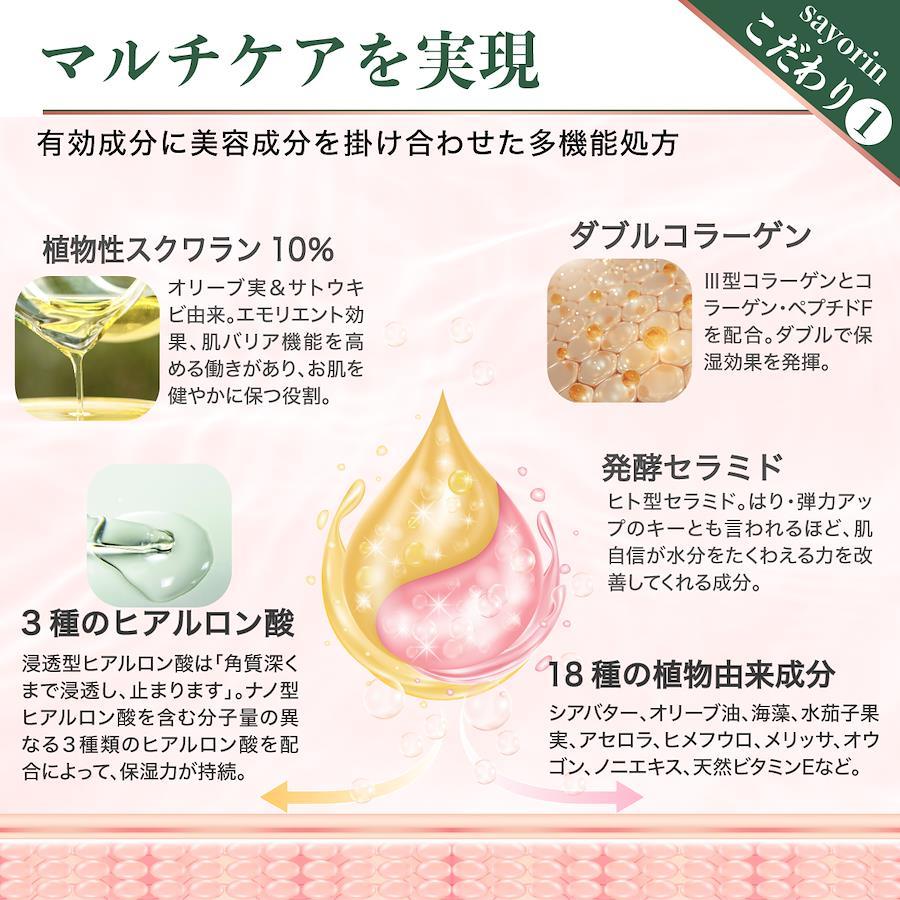 有効成分:ナイアシンアミド、グリチルリチン酸2Kその他の成分:マルトース・ショ糖縮合物、シア脂、オリブ油、ノニ果汁、ステアロイルフィトスフィンゴシン、アセチル化ヒアルロン酸ナトリウム、ヒアルロン酸Na-2、加水分解ヒアルロン酸、海藻エキス-1、アセロラエキス、水ナス果実エキス、黒砂糖エキス、コラーゲン・トリペプチド F、ヒメフウロエキス、メリッサエキス、オウゴンエキス、サクシニルアテロコラーゲン液、セイヨウハッカエキス、BG、シュガースクワラン、植物性スクワラン、濃グリセリン、グリセリン、ステアリン酸ポリグリセリル、メドウフォーム油、親油型ステアリン酸グリセリル、トリエチルヘキサン酸グリセリル、ステアリルアルコール、ジメチコン、ラウロイルグルタミン酸ジ(フィトステリル・オクチルドデシル)、カルボキシビニルポリマー、キサンタンガム、水酸化K、天然ビタミンE、ジエチレントリアミン5酢酸5Na液、1,2-ペンタンジオール、フェノキシエタノール