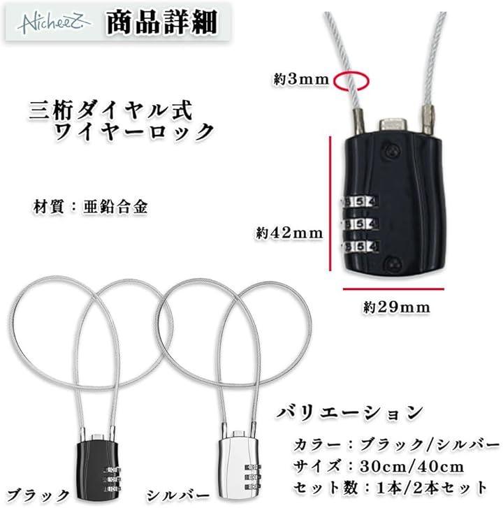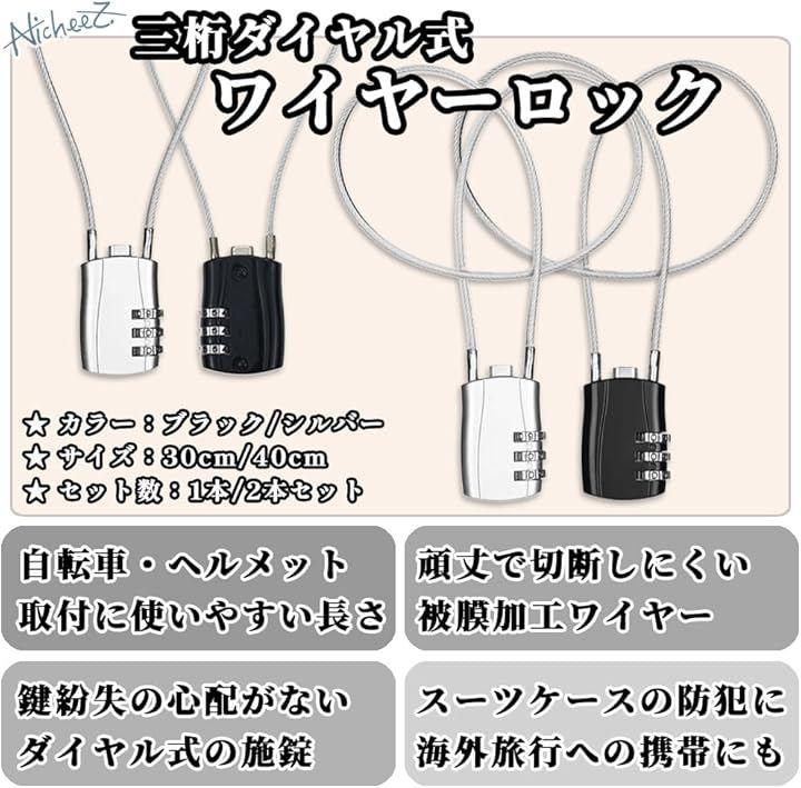 「商品内容」 三桁ダイヤル式ワイヤーロック(1本/2本セット) 材質:亜鉛合金 カラー:シルバー/ブラック サイズ:(40cm)ダイヤル部分縦/約42mm 横/約29mm ワイヤー長さ:約400mm 太さ:約3mm (30cm)ダイヤル部分縦/約42mm 横/約29mm ワイヤー長さ:約300mm 太さ:約3mm