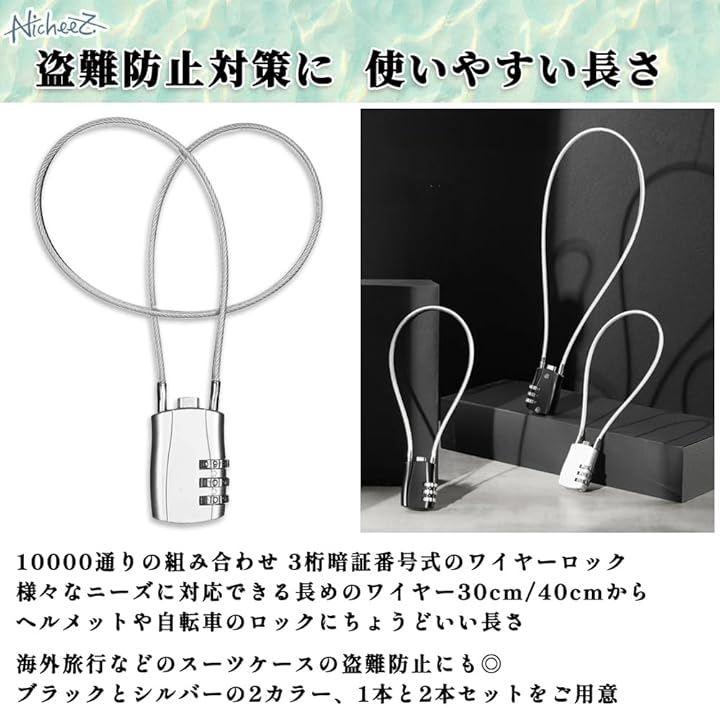 「商品内容」 三桁ダイヤル式ワイヤーロック(1本/2本セット) 材質:亜鉛合金 カラー:シルバー/ブラック サイズ:(40cm)ダイヤル部分縦/約42mm 横/約29mm ワイヤー長さ:約400mm 太さ:約3mm (30cm)ダイヤル部分縦/約42mm 横/約29mm ワイヤー長さ:約300mm 太さ:約3mm