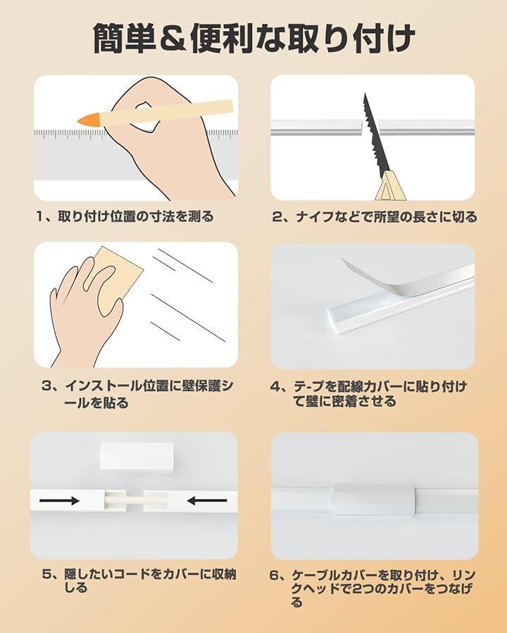 「簡単な取り付け」この配線カバーセットは、強力な粘着テープを使用して、壁や床に簡単に取り付けできます。