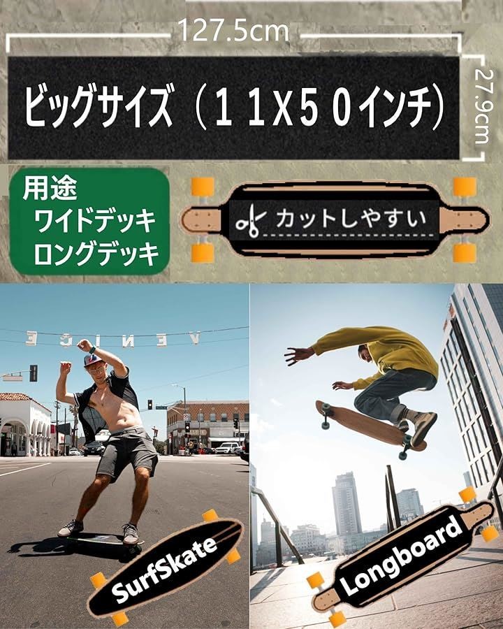 ロンスケ、サーフスケート、横幅と縦の長さのある物は11x50インチ(27.9cmx127cm)。