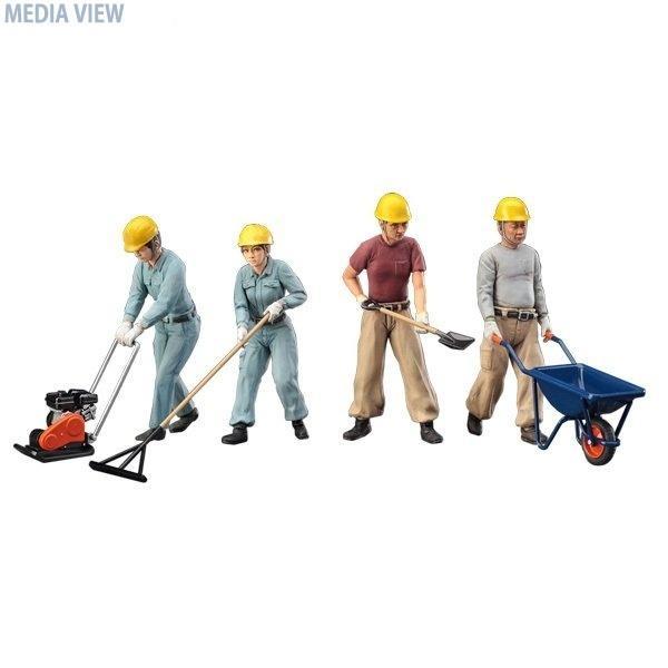 ハセガワ WM03 1/35 建設作業員セットA プラモデル 舗装工事のシチュエーションを再現した、作業員と機材のセットです。若手のレーキ作業員(女性)とプレート作業員(男性)、ベテラン(男性)のスコップ作業員と一輪車作業員の計4体をセット。フィギュア原型は辻村聡志 氏が担当します。振動ローラや、油圧ショベルと組み合わせると臨場感がアップします!1/35スケールプラスチックモデル※組み立て・塗装の必要なプラモデルです。完成品ではございませんのでご注意ください。