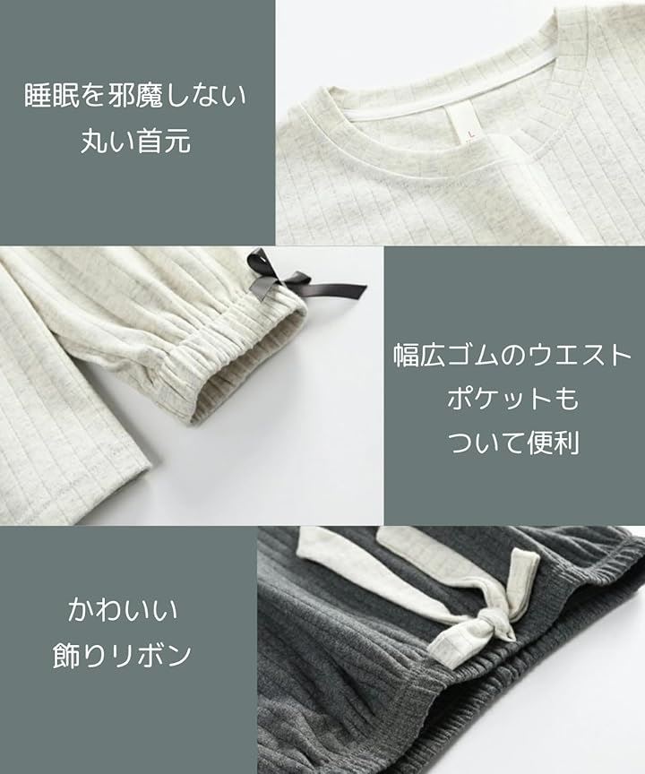 「丸首デザインでストレスフリー」丸首デザインで首元がゆったりしているから、着脱しやすく寝返りや就寝時の動きも快適。