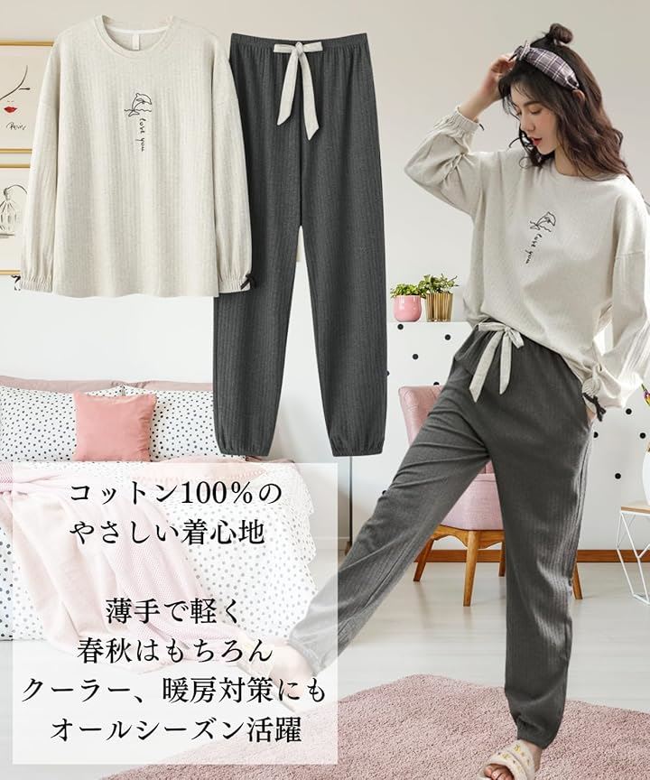 柔らかい薄手長袖の綿100%レディースパジャマは、一年中活躍するルームウェア 部屋着 ナイトウェアです。