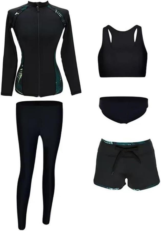 海やプールで頼れる5点セット:このラッシュガードセットは、長袖トップス・ブラトップ・ショートパンツ・レギンス・インナーパンツの5点が一式揃っており、スポーツやレジャー、海やプールでの水遊びに幅広く対応します。