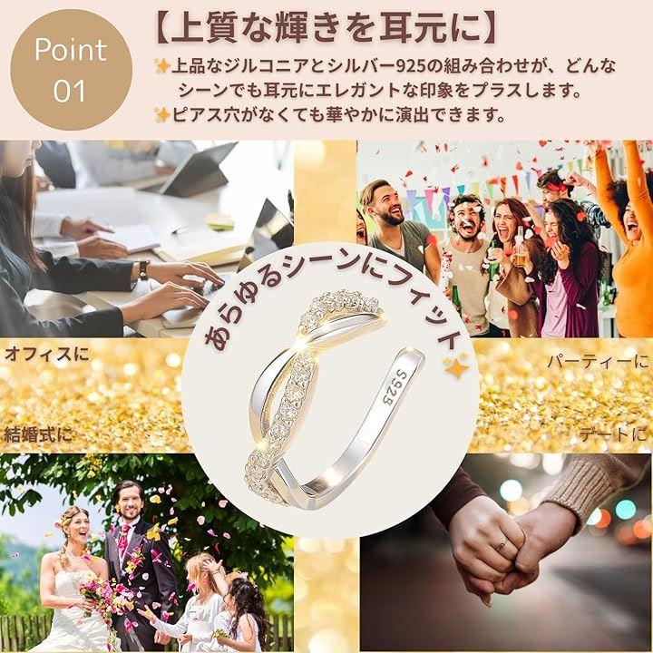 「ウェーブタイプ製品仕様」 サイズ:直径約13.0mm x 内径約9.4mm x 厚み約5.6mm x 着用口約3.7mm、ストーン直径:約1.2mm、重量:2.2g 、カラー:シルバー 「クロスタイプ製品仕様」 サイズ:1.1cmx1.1cmx0.2cm、重量:2.2g、カラー:シルバー 「パールタイプ製品仕様」 サイズ:約17mm x 20mm、重量:約2.2g/個、カラー:シルバー、左右セット