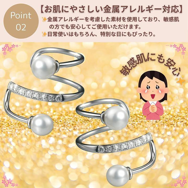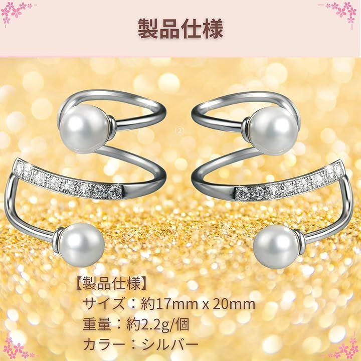 「ウェーブタイプ製品仕様」 サイズ:直径約13.0mm x 内径約9.4mm x 厚み約5.6mm x 着用口約3.7mm、ストーン直径:約1.2mm、重量:2.2g 、カラー:シルバー 「クロスタイプ製品仕様」 サイズ:1.1cmx1.1cmx0.2cm、重量:2.2g、カラー:シルバー 「パールタイプ製品仕様」 サイズ:約17mm x 20mm、重量:約2.2g/個、カラー:シルバー、左右セット