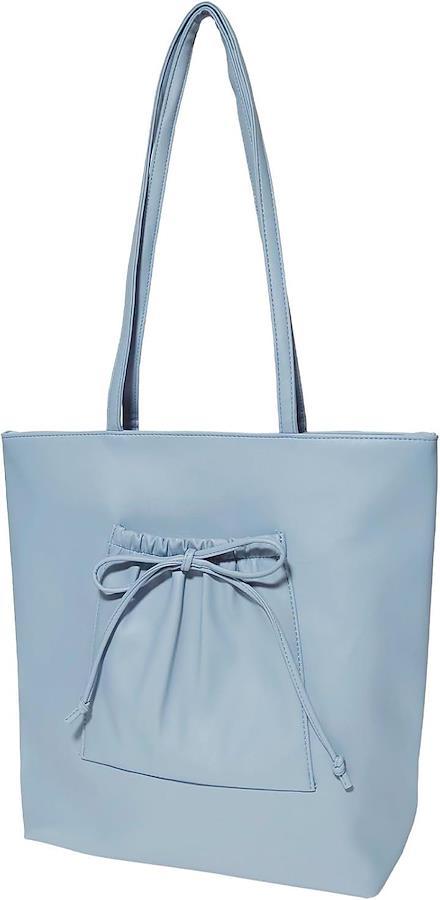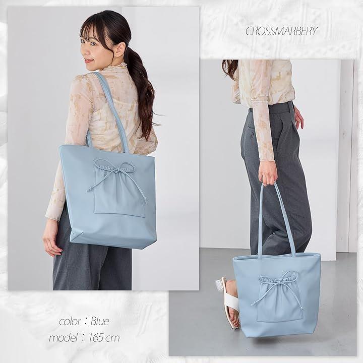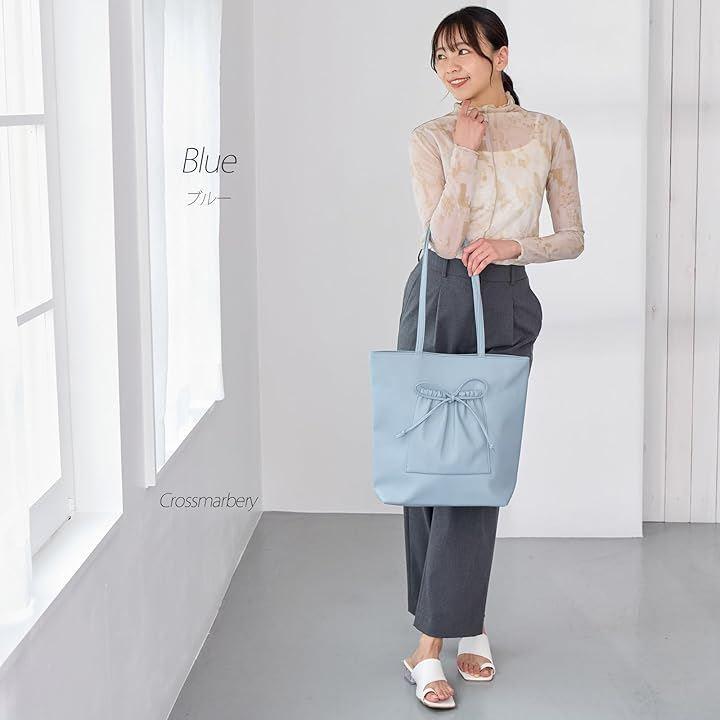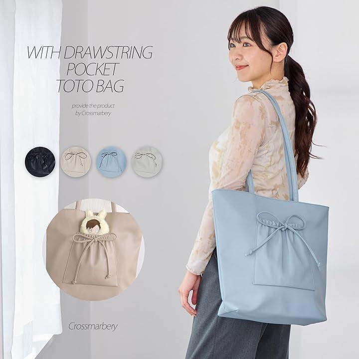 正面の巾着ポケットとリボンが可愛いA4対応トートバッグ開閉はマグネットボタンで内側にはオープンポケットが2つとファスナーポケットが1つ付いています。