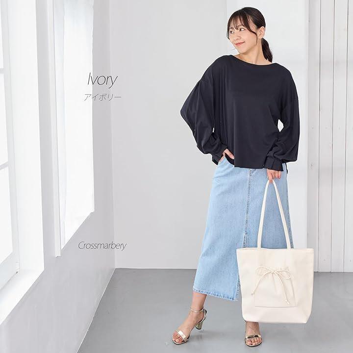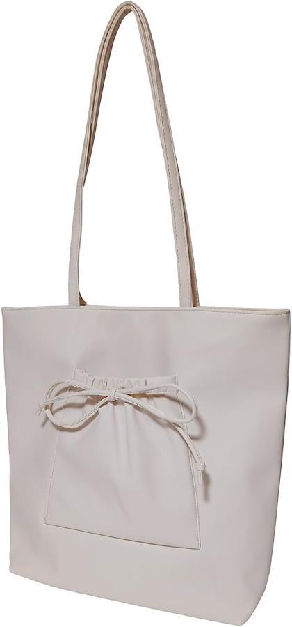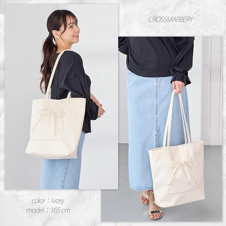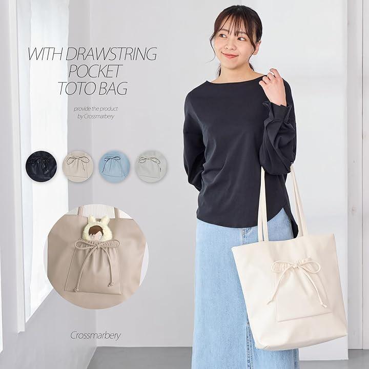 正面の巾着ポケットとリボンが可愛いA4対応トートバッグ開閉はマグネットボタンで内側にはオープンポケットが2つとファスナーポケットが1つ付いています。