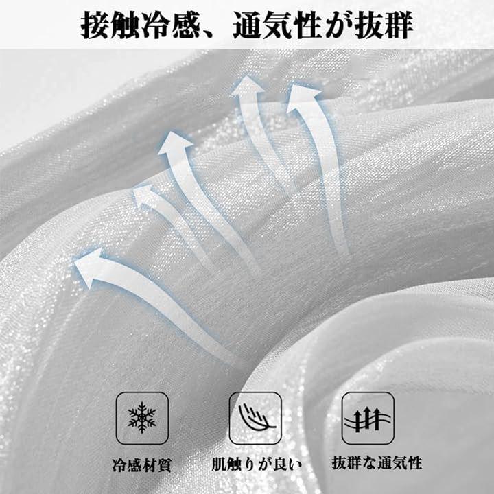 「接触冷感、UVカット」:肌に優しい冷感材質を採用し、使用時に肌からの熱移動が多く、ひんやりとした着心地を体感できます。