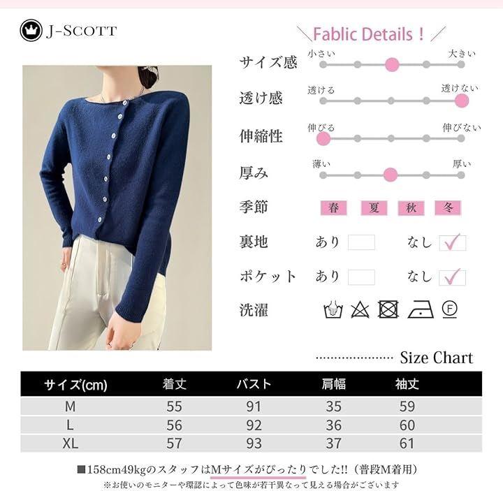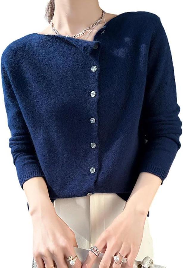 「上品さを引き立てるアシンメトリーカーディガン」 斜めに配したボタンラインがさりげない個性を演出し、シンプルながら洗練された印象を与えるカーディガン。