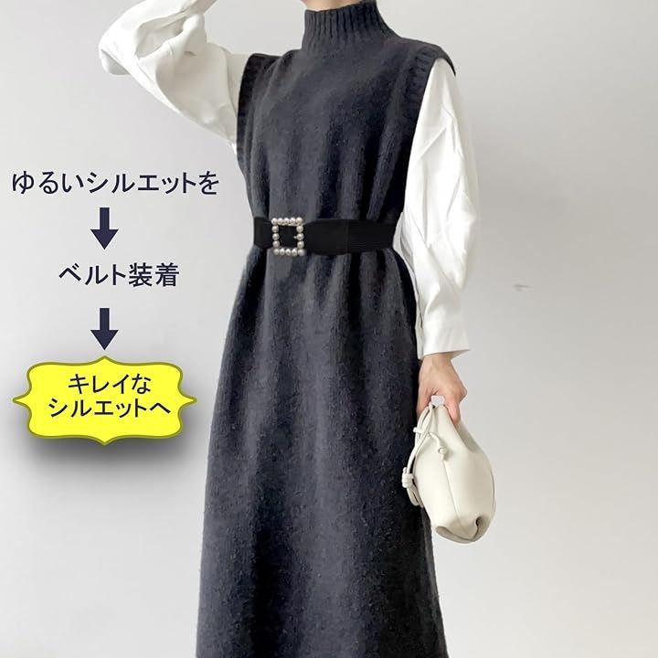 温かみのある、ほっこりニット素材のワンピースをゆるく着ている時などに、ゴムベルトを付けることできれいなシルエットで一気におしゃれにしてくれる。ウエストマークのアクセとしても大活躍してくれます。