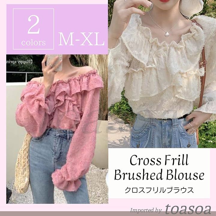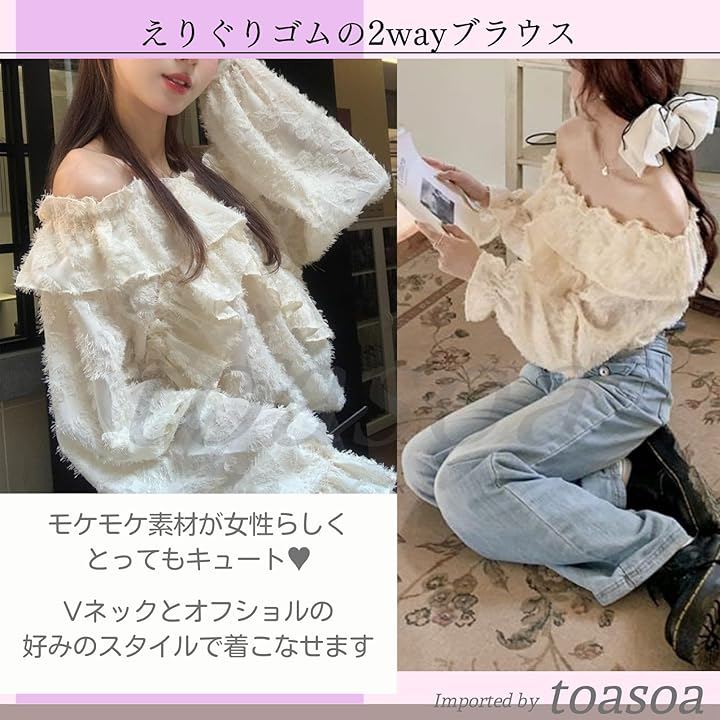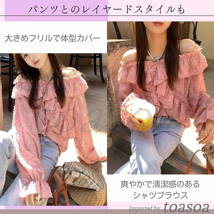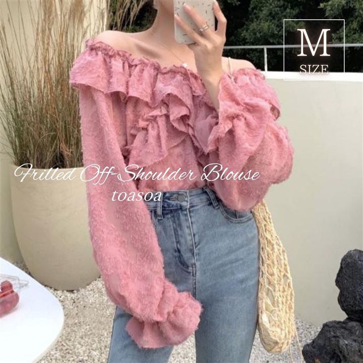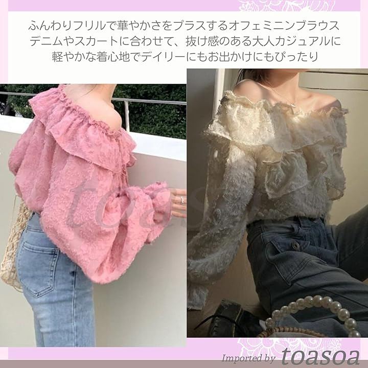 オフショルダーと大きいフリルが特徴的なレース ブラウス トップス。