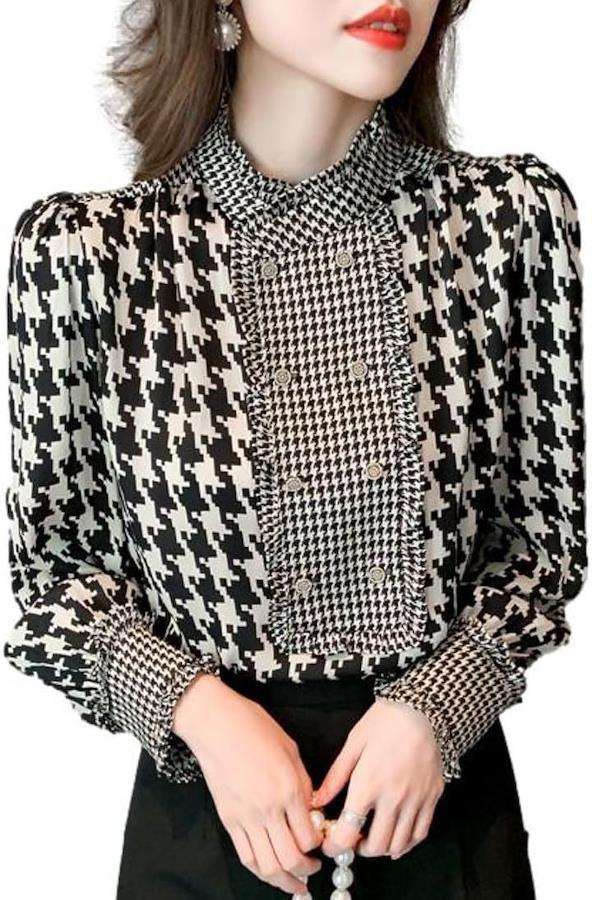 「クラシカルに華やぐ千鳥格子プリント」 柔らかくとろみのあるシフォン素材に、クラシカルで気品溢れるブラック&ホワイトの千鳥格子プリントがクラシカルに映えるブラウス。