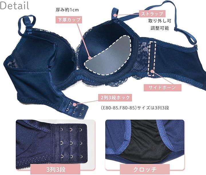 「 特徴 」レース / Uバック / 花柄 / 脇高 / 刺繍 / ストラップ調整可 ・ 取り外し可 / パッドポケットなし / 取り外しパッドなし / 下厚カップ約 1cm / ワイヤーあり / サイドボーンあり / 伸縮性あり / 2列x3段ホック / E80,85 F80,85 3列3段ホック