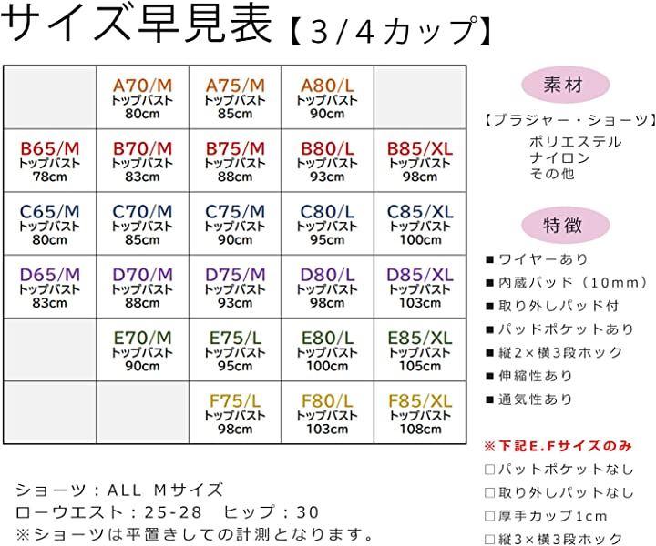 「特徴」<全サイズ共通>ストラップ取り外し可能/ストラップ調節可能/ワイヤーあり/伸縮性・通気性あり/ショーツフルバック <A-Dサイズ>パットポケットあり/取り外し可能パット付き/厚手カップ約1cm/2x3ホック <EFサイズ>パットポケットなし/取り外しパットなし/厚手カップ約1cm/3x3ホック
